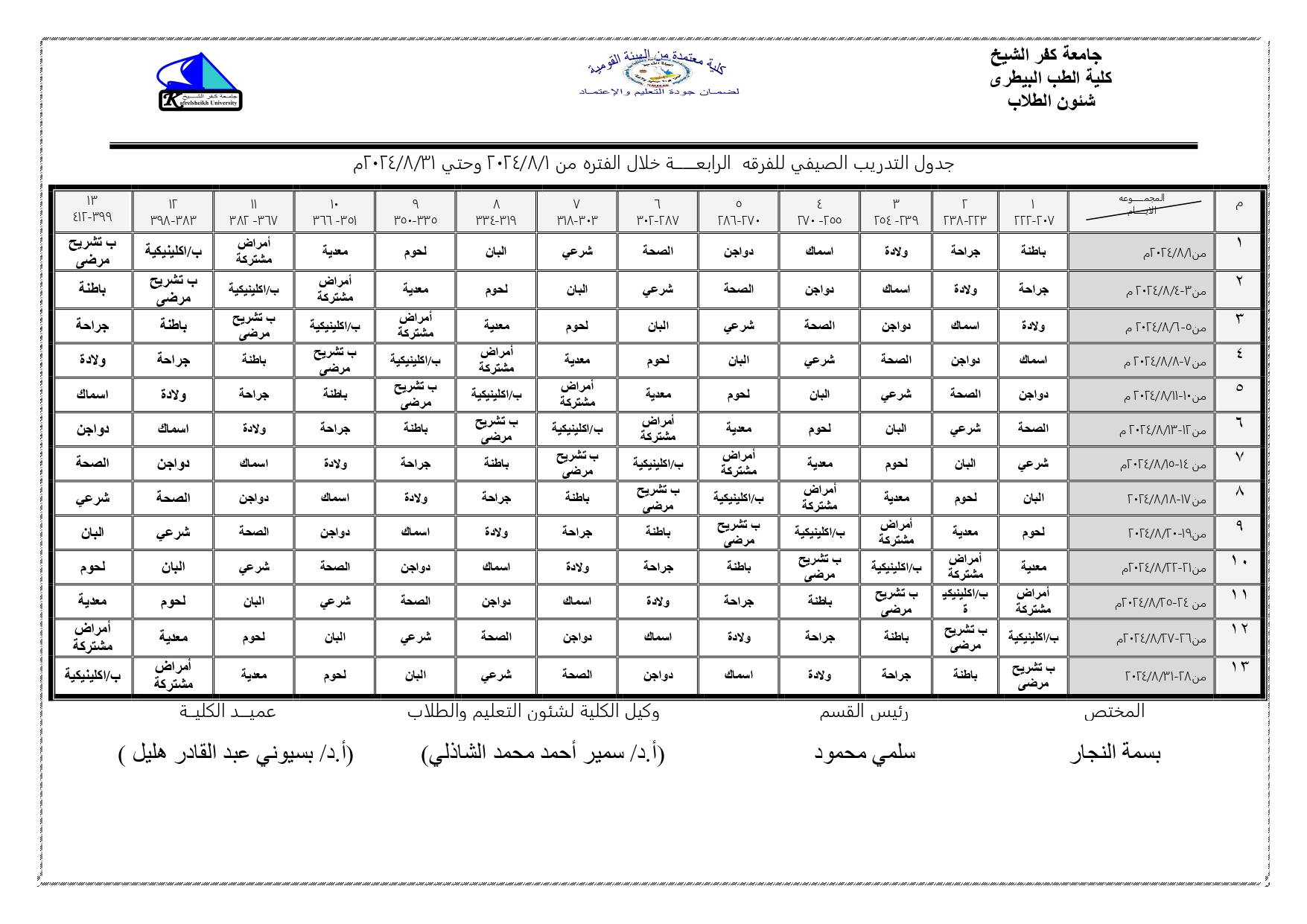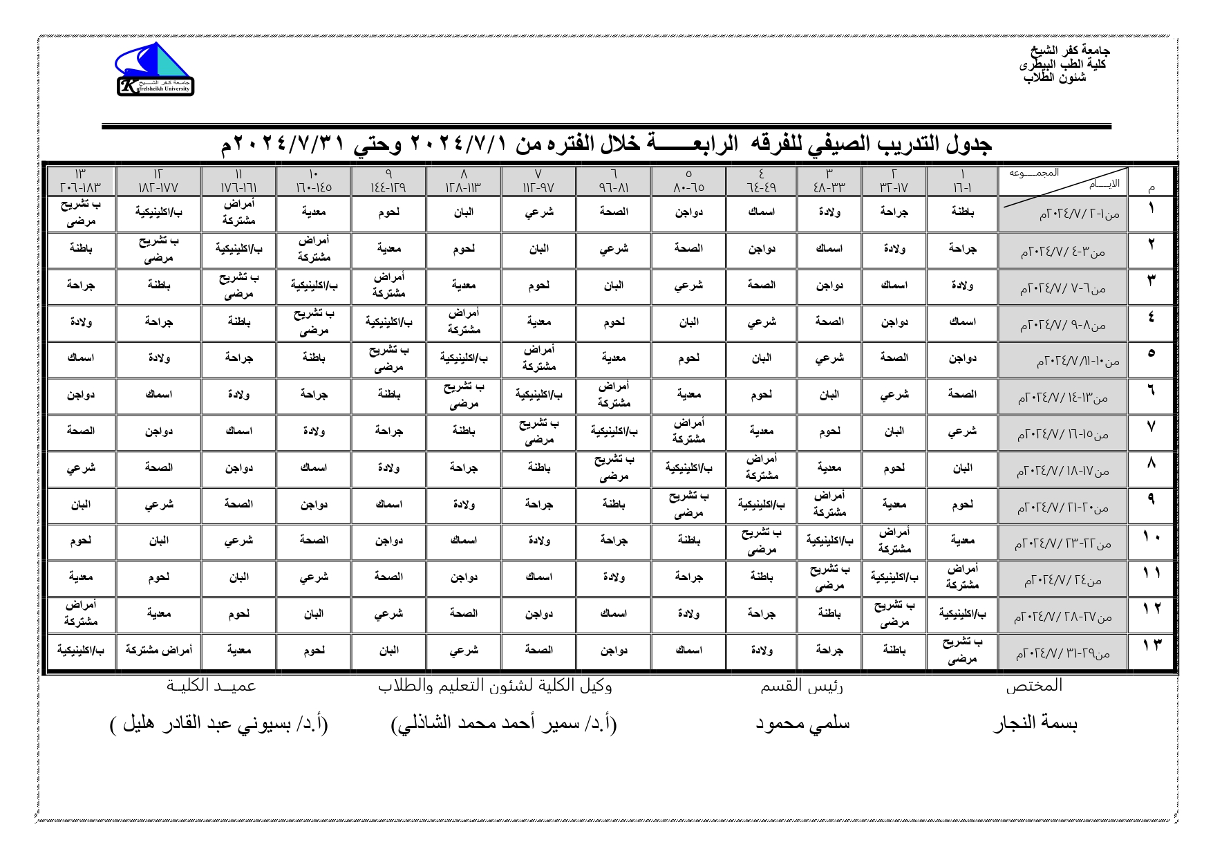 جداول التدريب الصيفى للفرقة الرابعة 2024