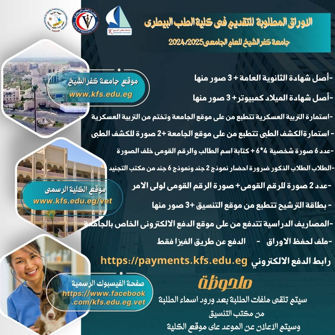 الاوراق المطلوبة للتقديم فى كلية الطب البيطرى - جامعة كفرالشيخ للعام الجامعى2025/2024