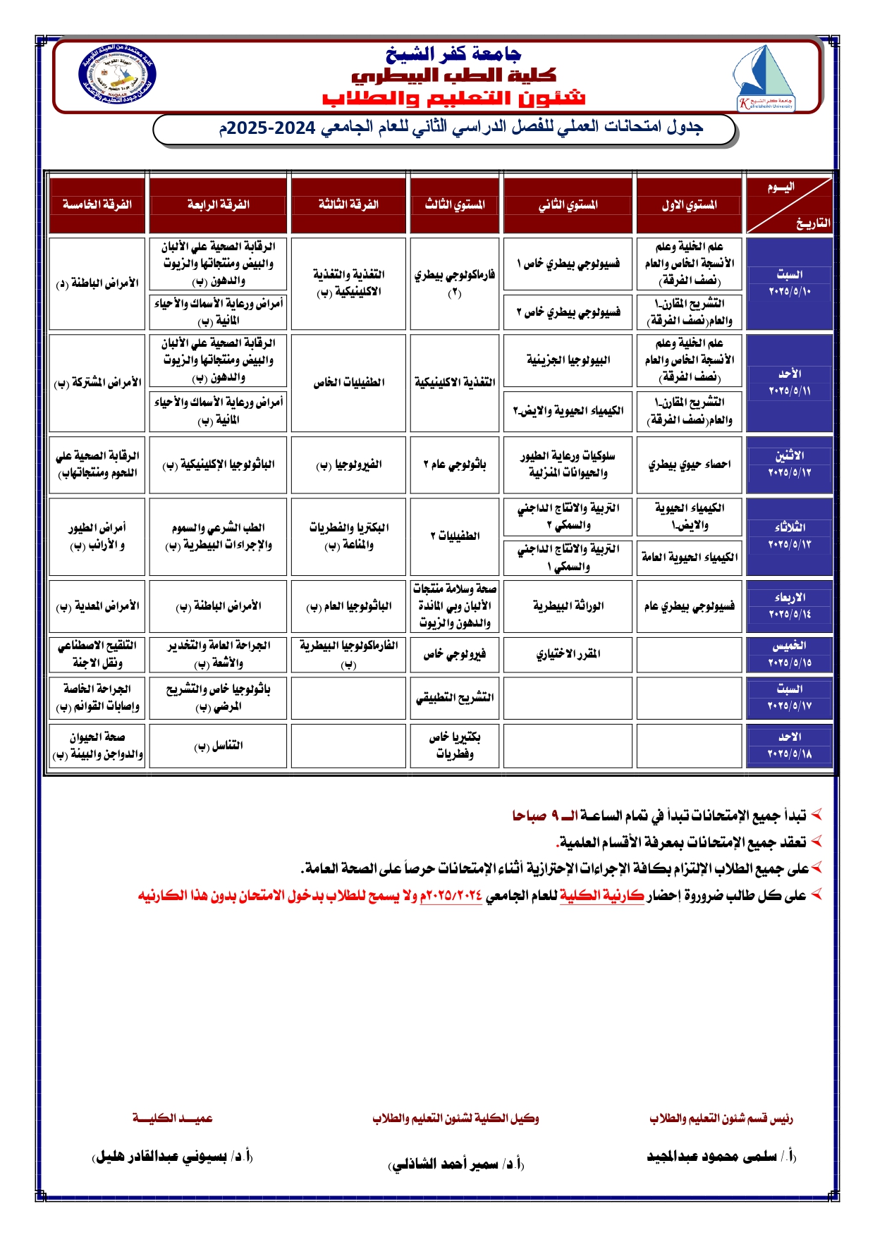 جدول امتحانات العملى للفصل الدراسى الثانى للعام الجامعى 2025/2024