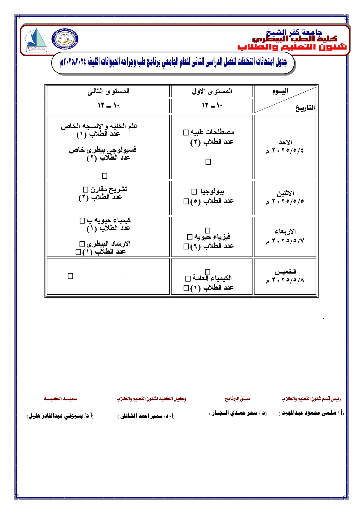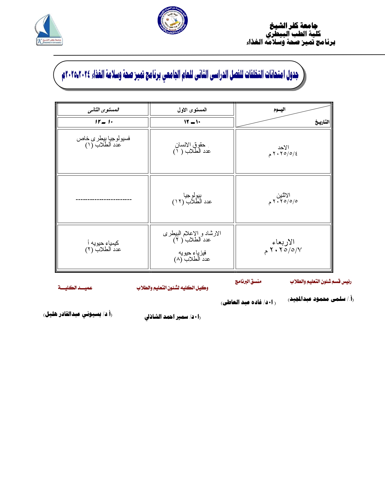 جدول امتحانات تخلفات الفصل الدراسى الثانى البرامج المميزة (صحة وسلامة الغذاء- حيوانات اليفة)2025/2024