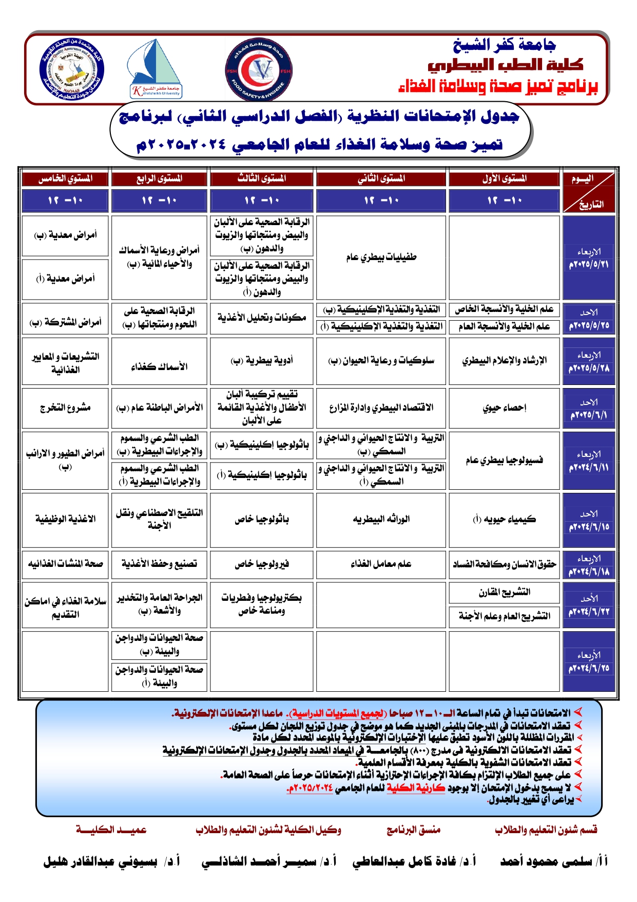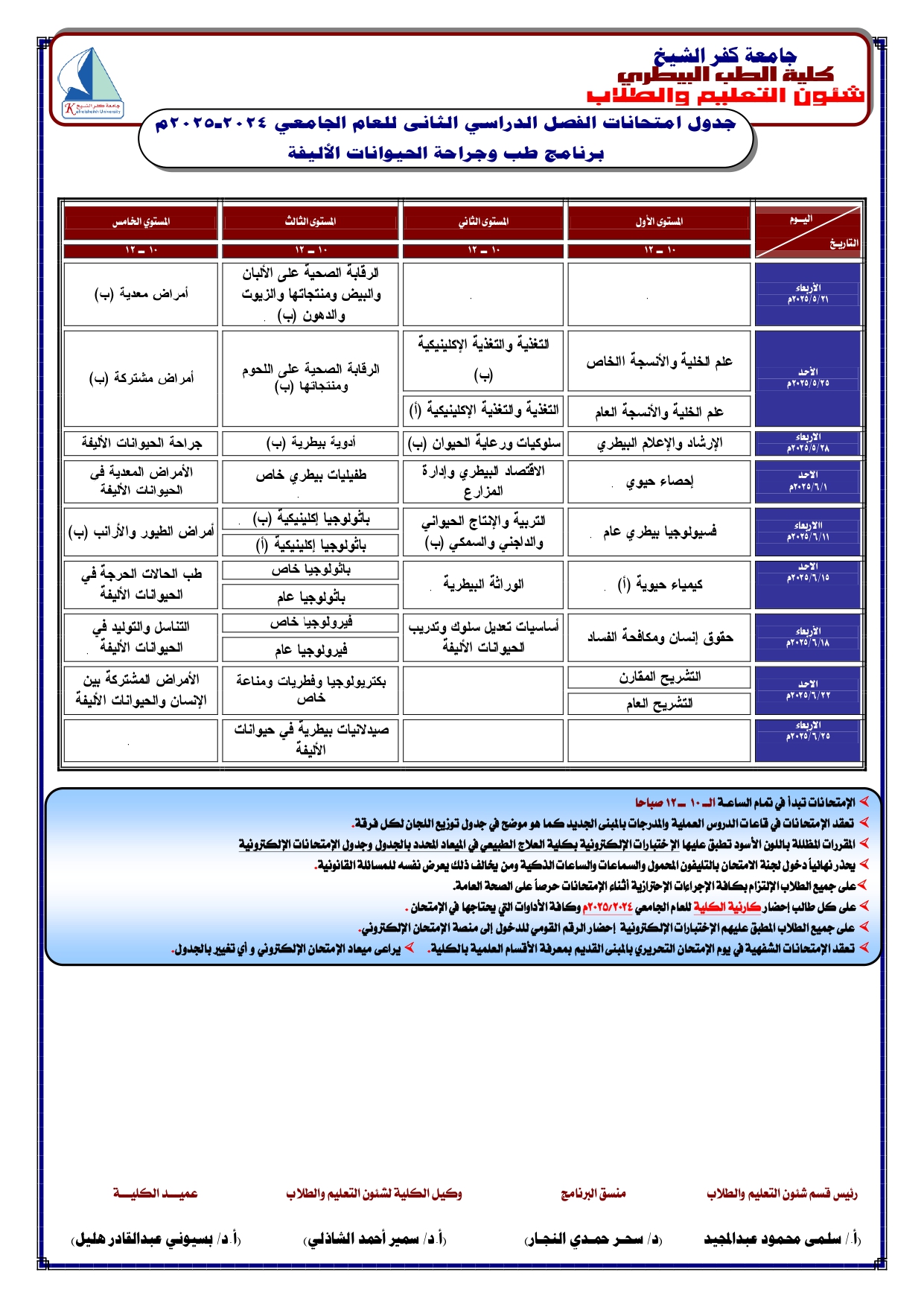 جدول امتحانات البرامج المميزةالفصل الثانى للعام الجامعى2025/2024 (صحةوسلامة الغذاء- جراحة الحيوانات الاليفة)