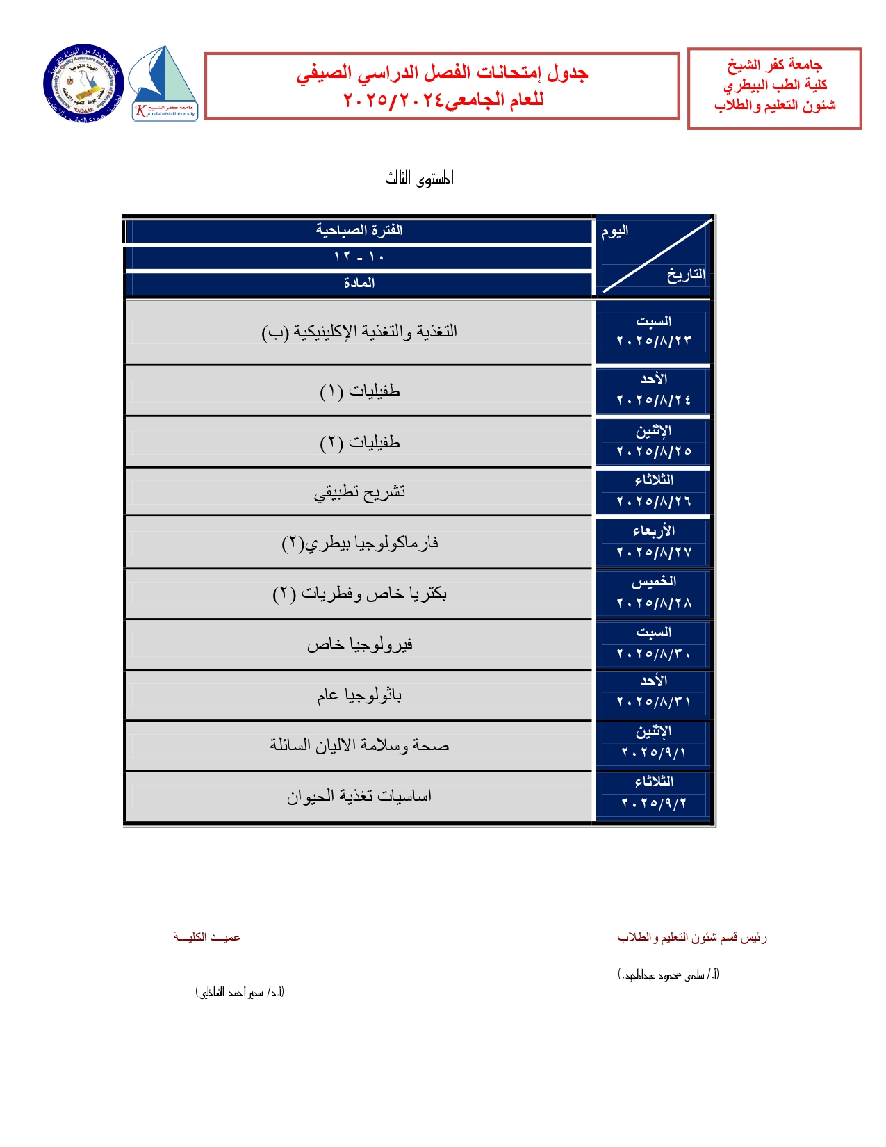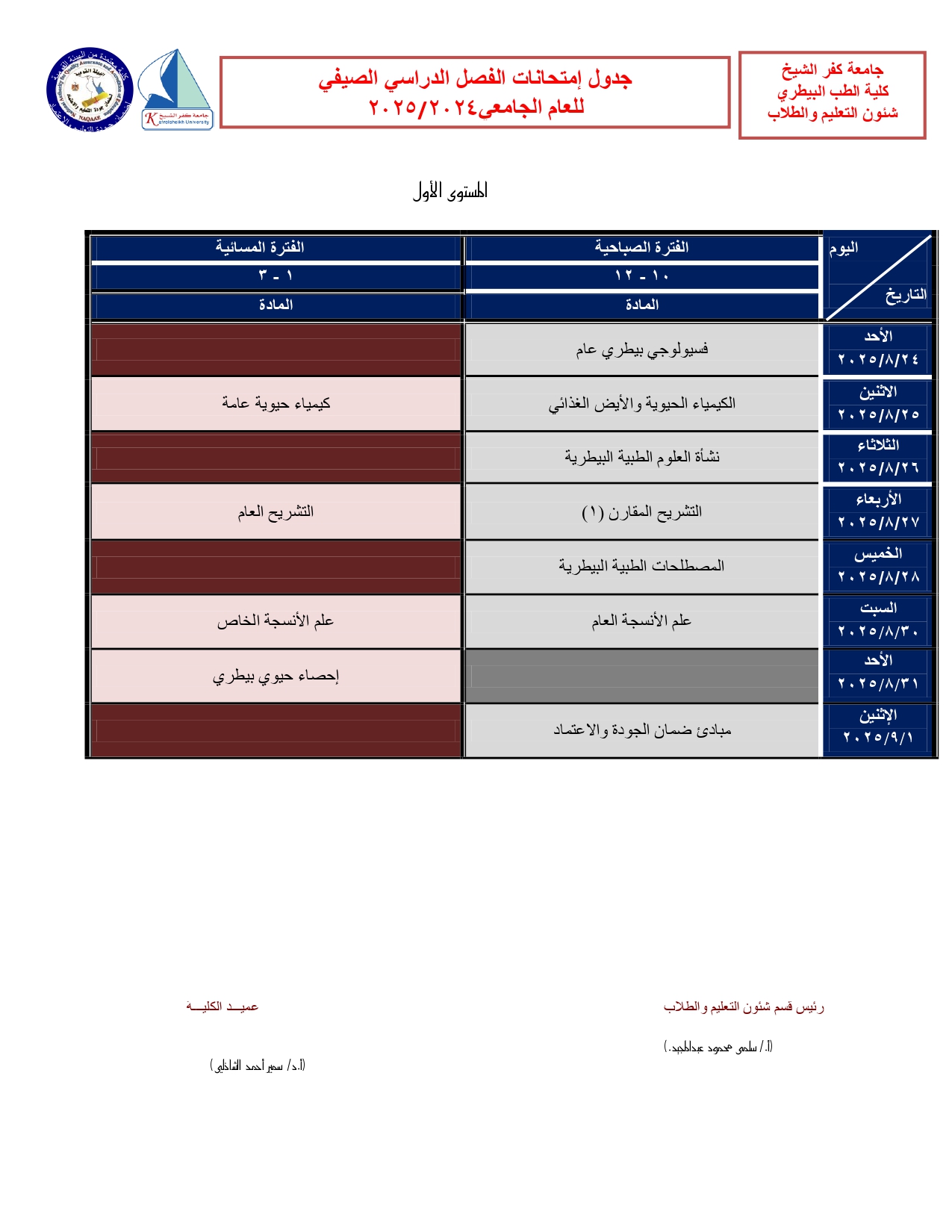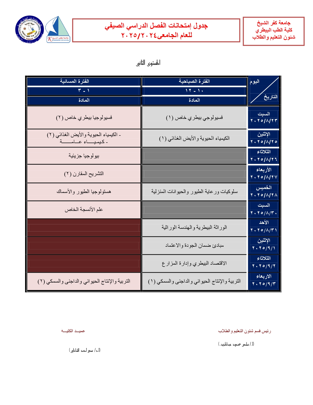 جدول امتحانات الفصل الدراسى الصيفى 2025/2024 (البرنامج العام)