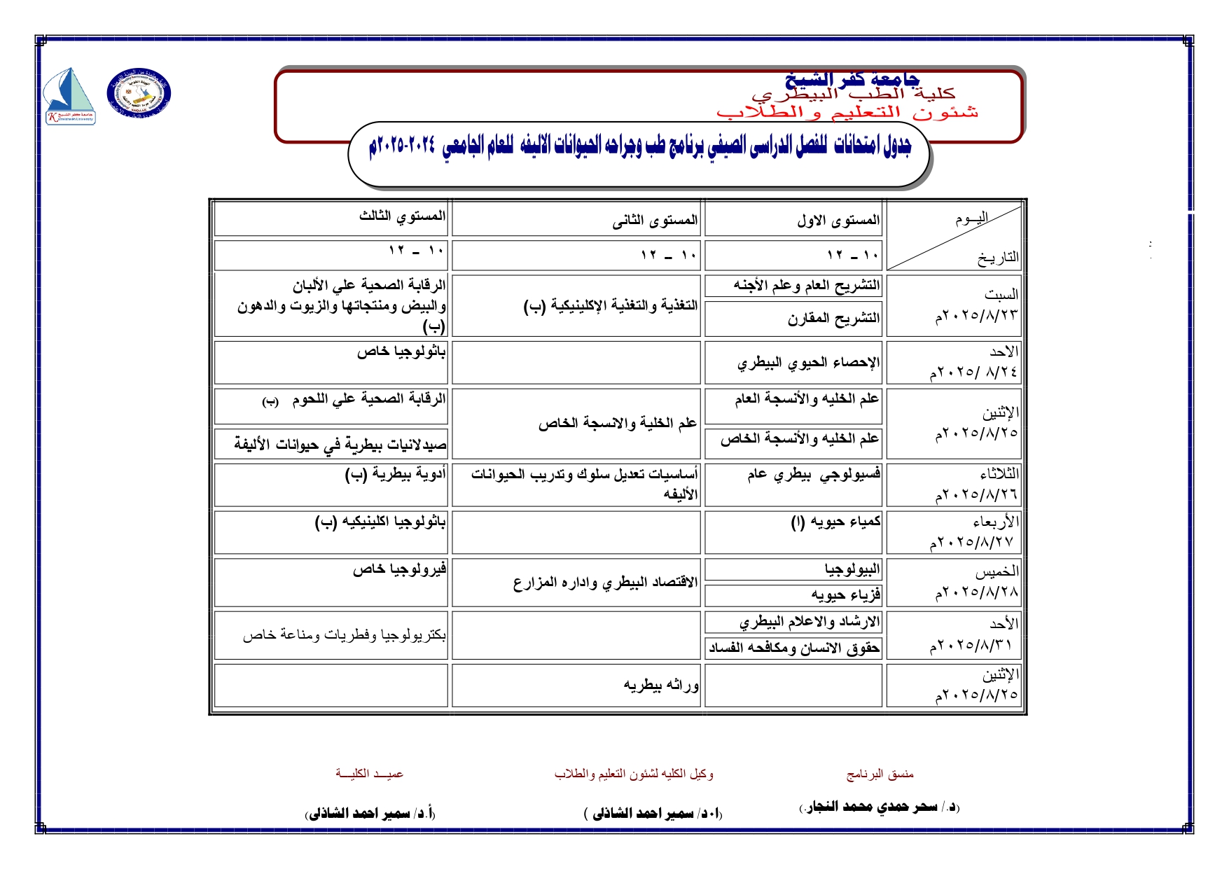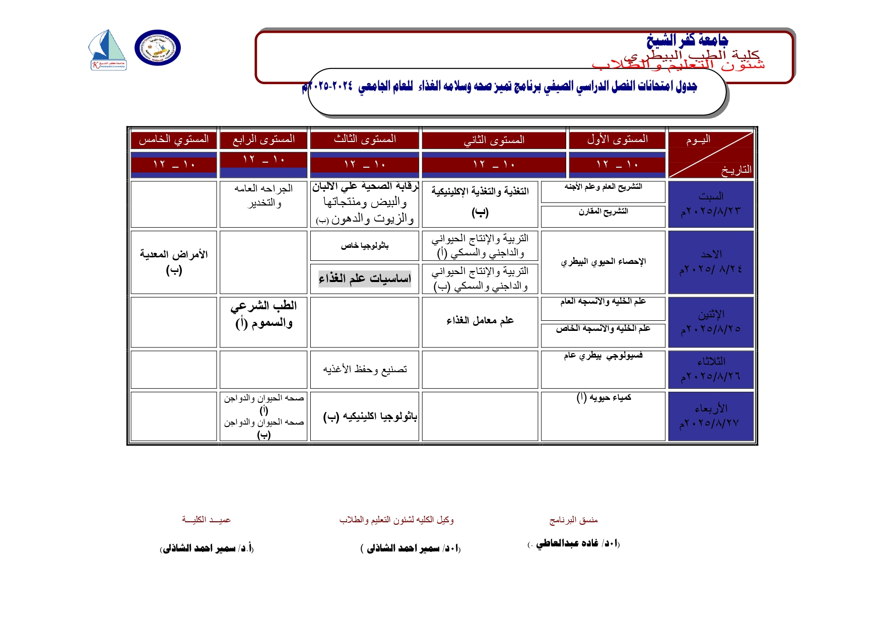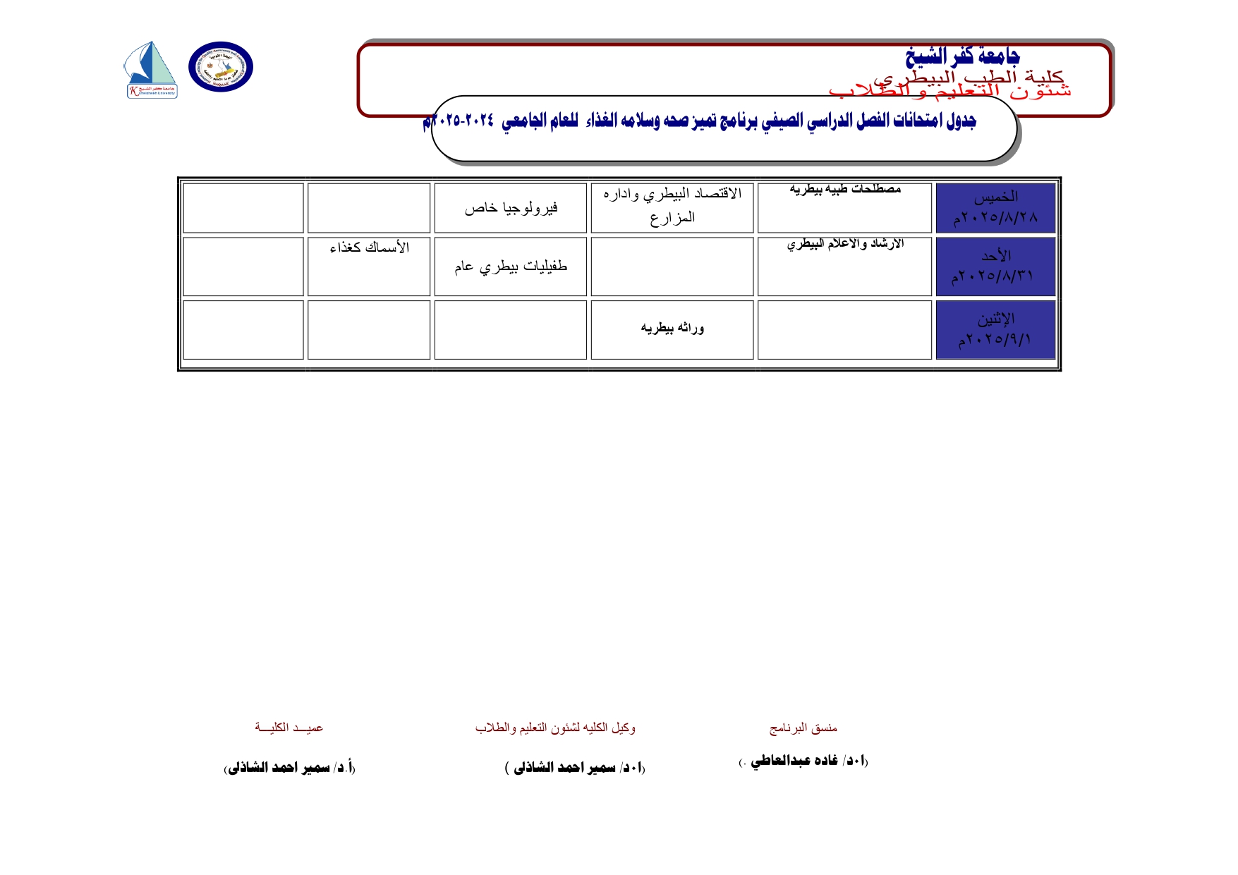 جدول امتحانات البرامج المميزة (صحة وسلامة الغذاء - حيوانات اليفة) الفصل الدرسى الصيفى 2025/2024