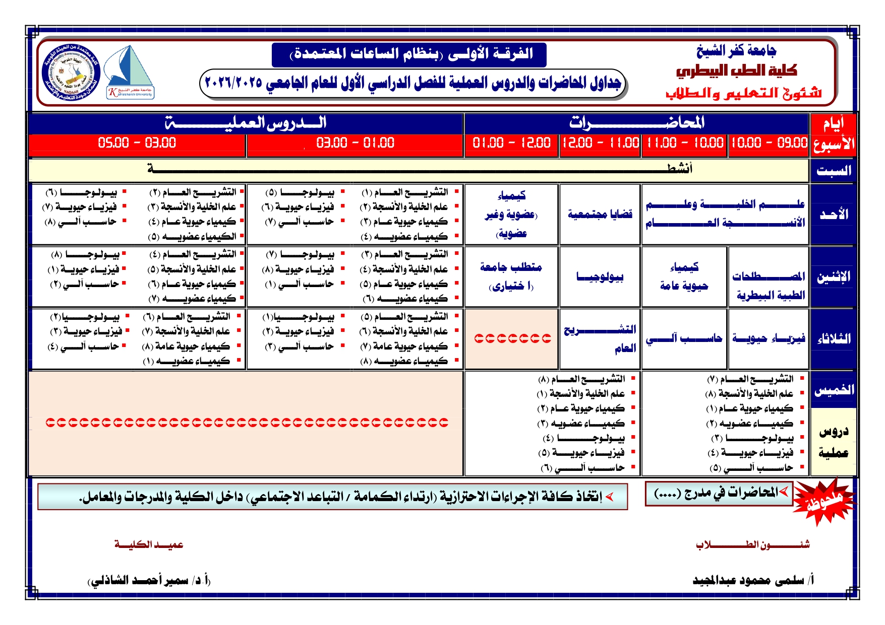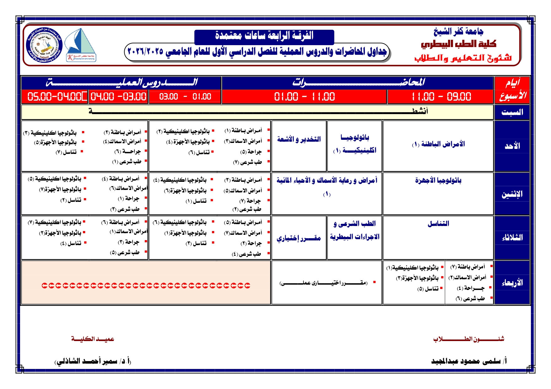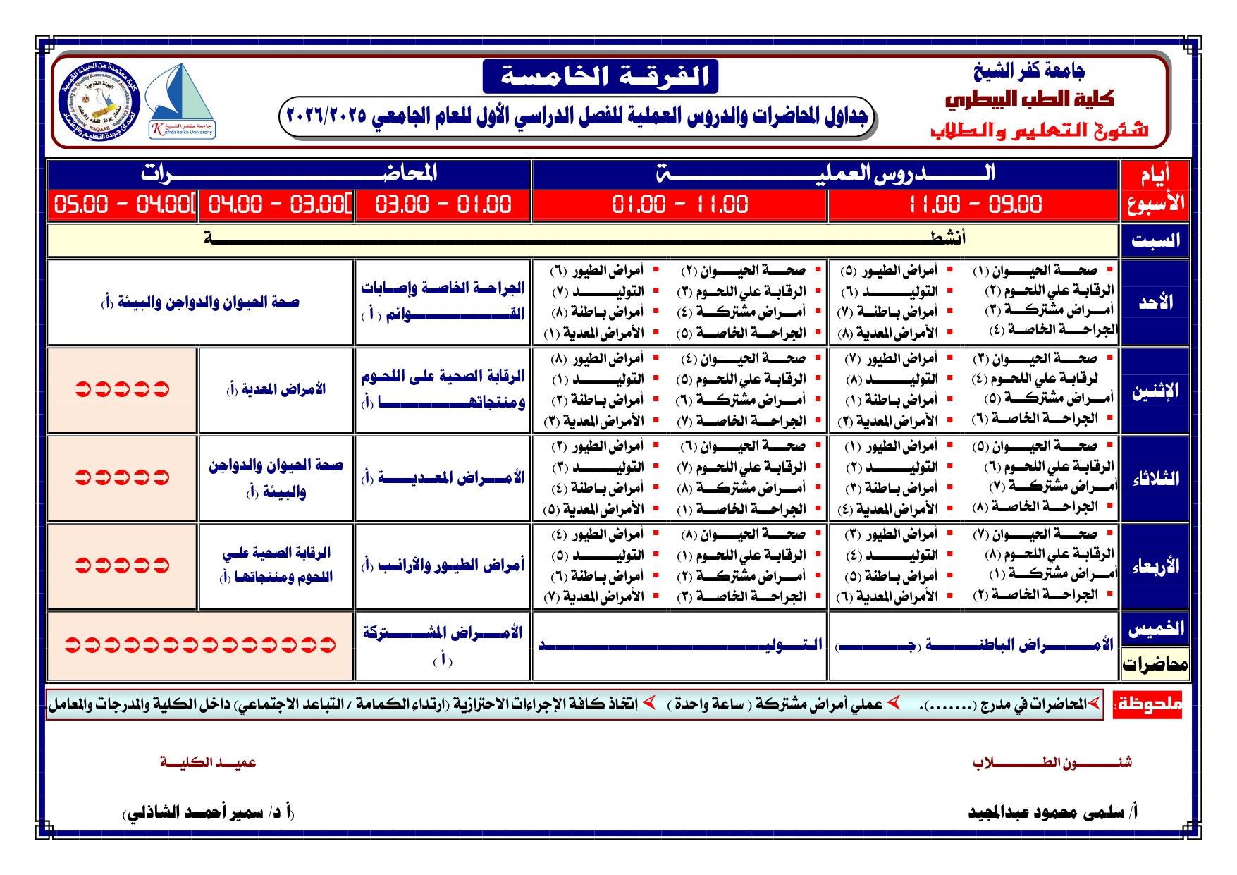 الجداول الدراسية الفصل الدراسى الاول للعام الجامعى2026/2025(ساعات معتمدة- سنوات دراسية)5
