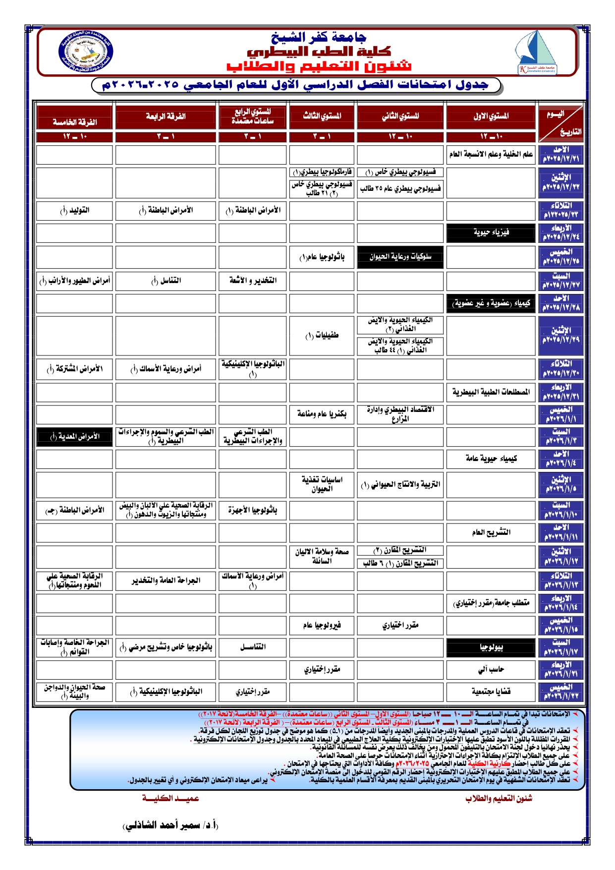 جدول امتحانات الفصل الدراسى الاول للعام الجامعى 2026/2025
