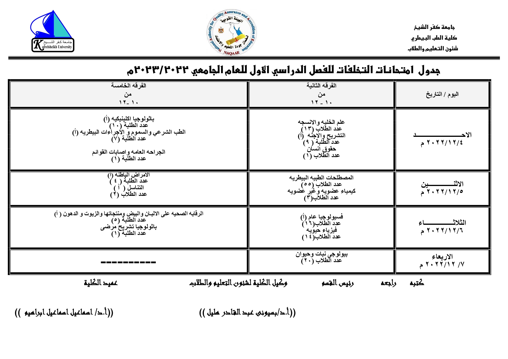 جدول امتحانات التخلفات للفصل الدراسى الاول للعام الجامعى 2022/2023