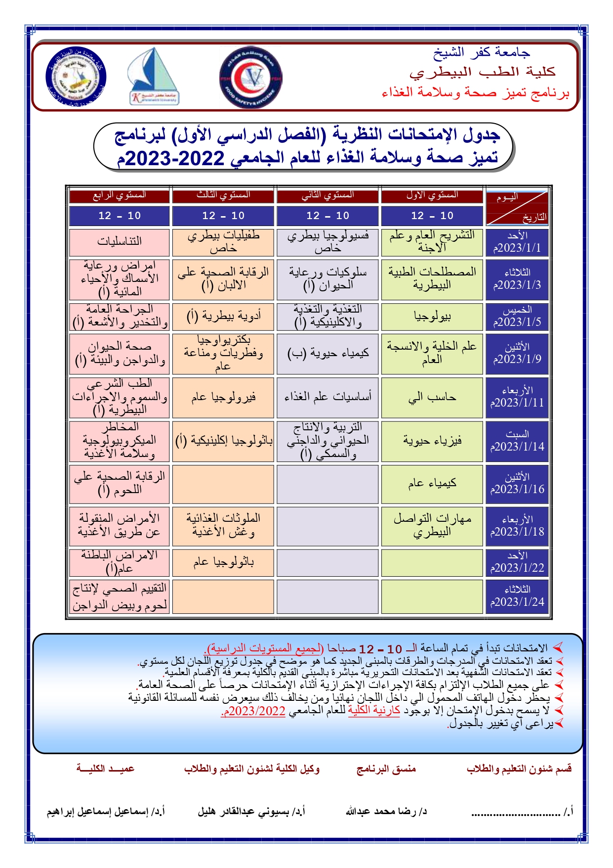 جدول متحان الفصل الدراسى الاول تميز برنامج صحة وسلامة الغذاء