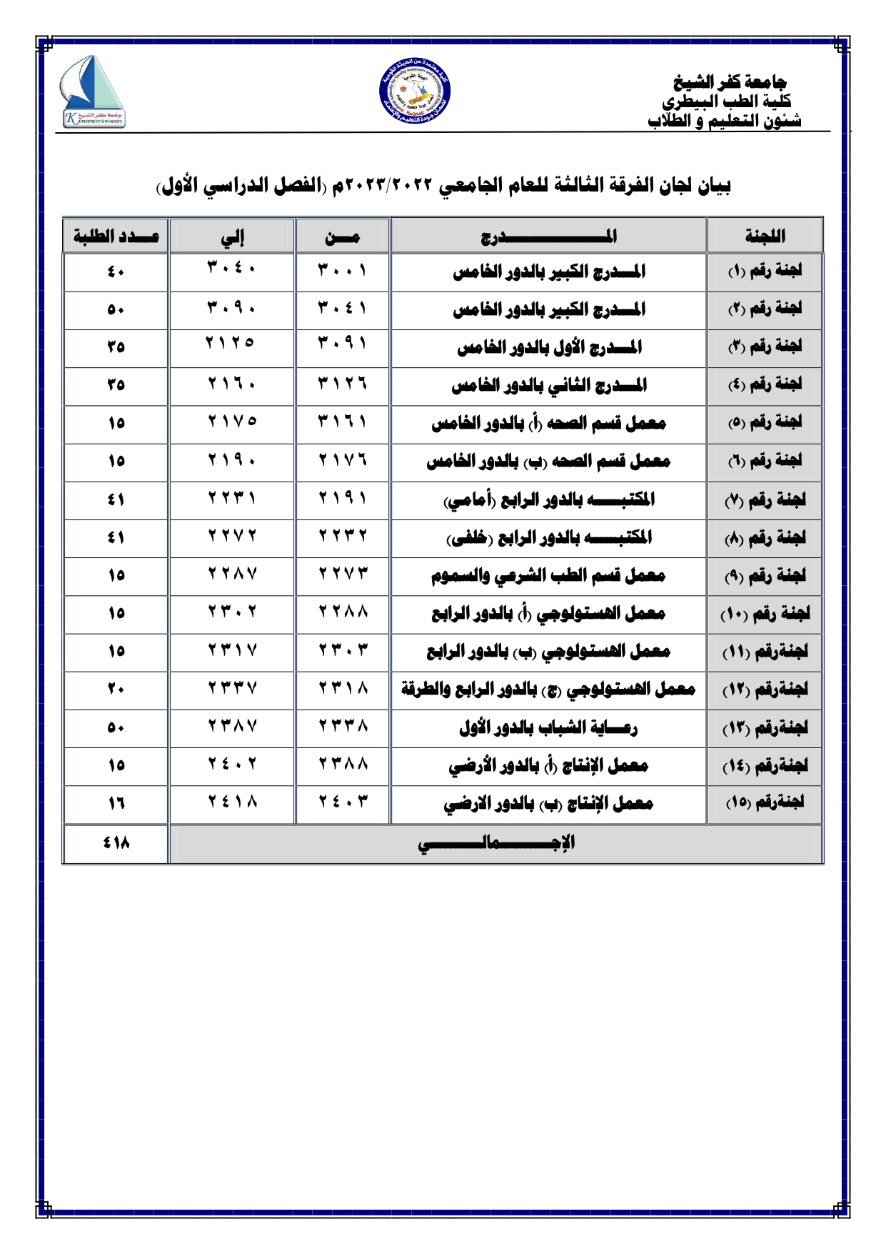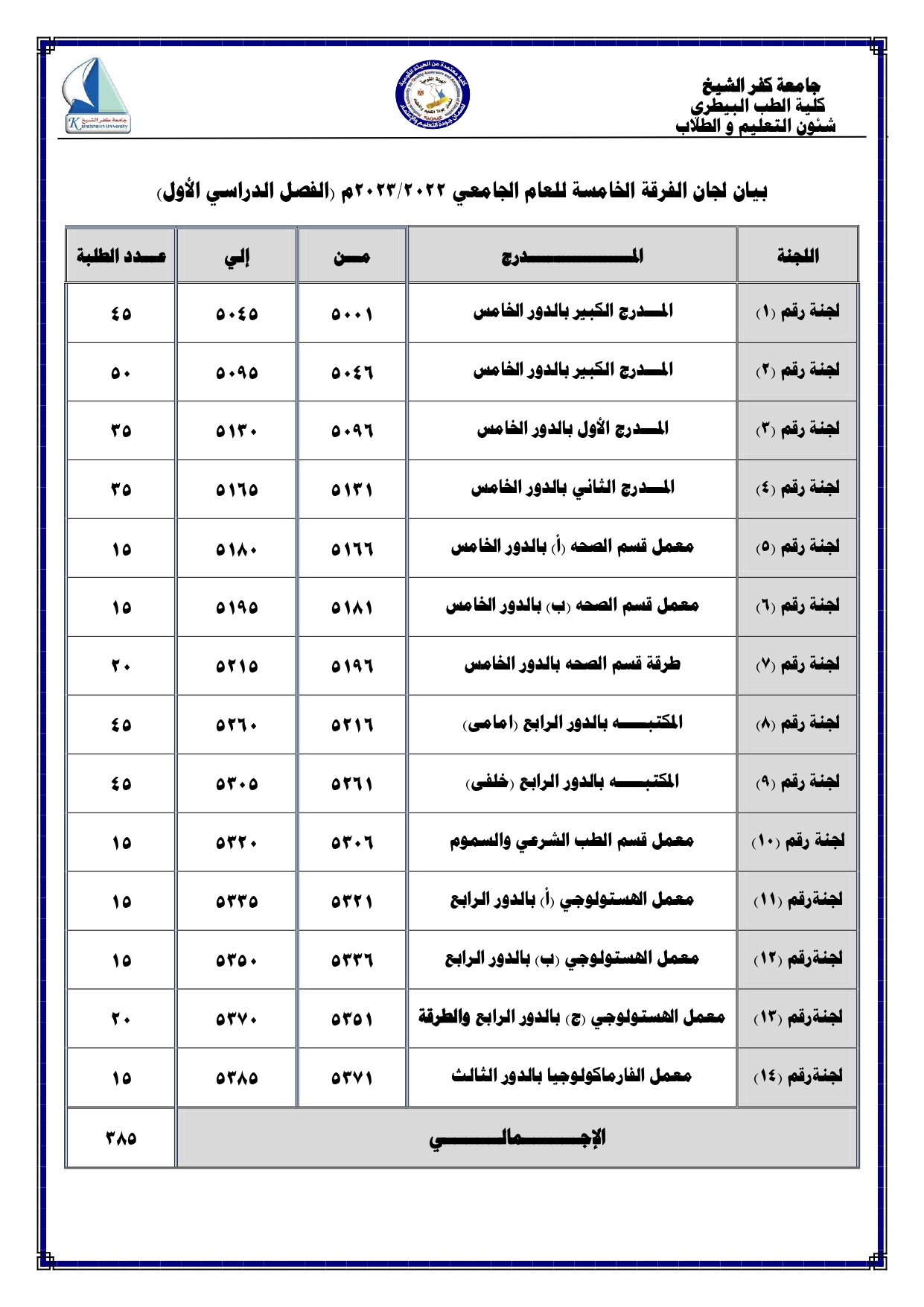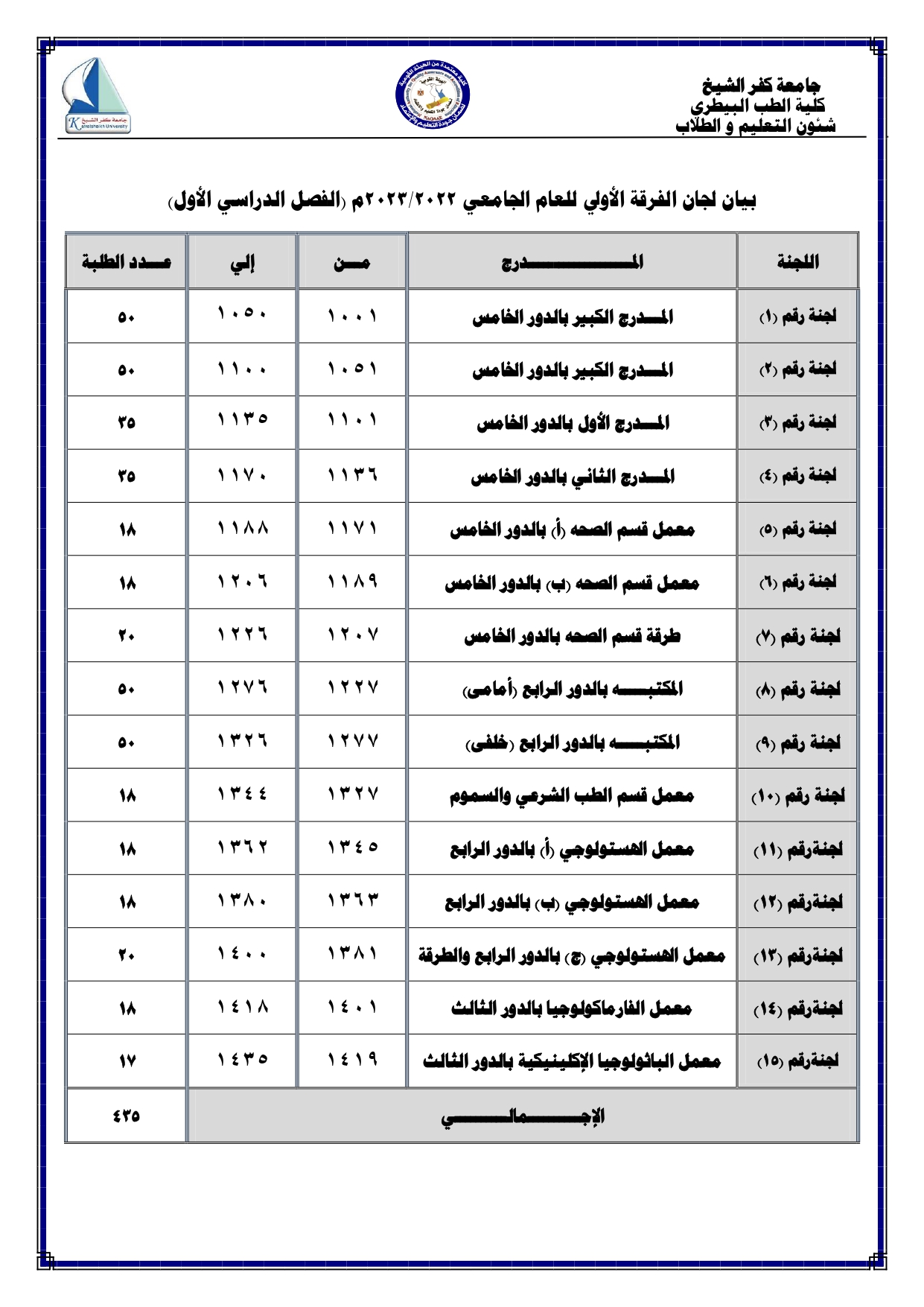 اماكن اللجان لجميع الفرق الدراسية للعام الجامعى 2022/2023