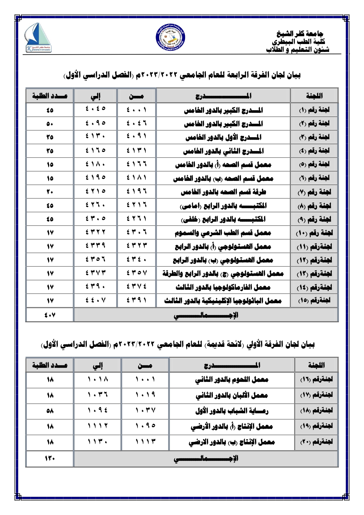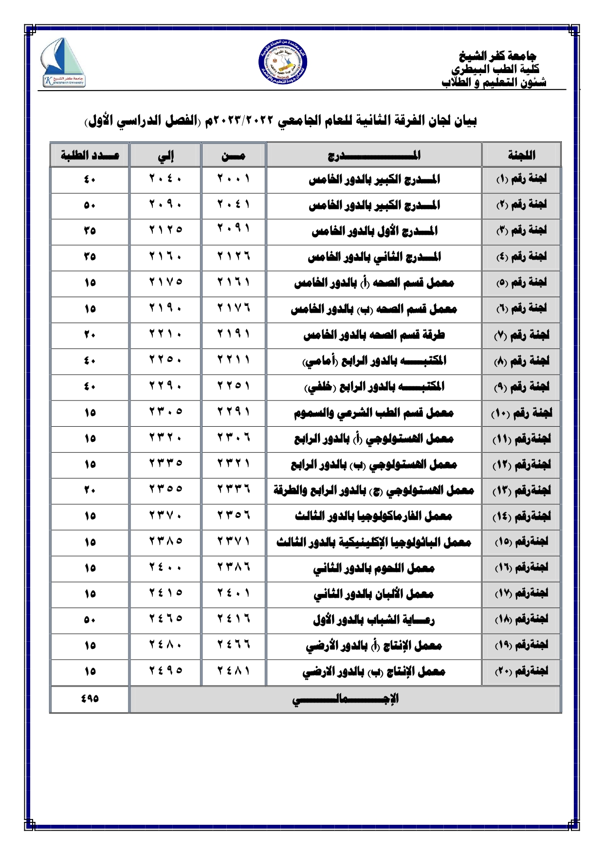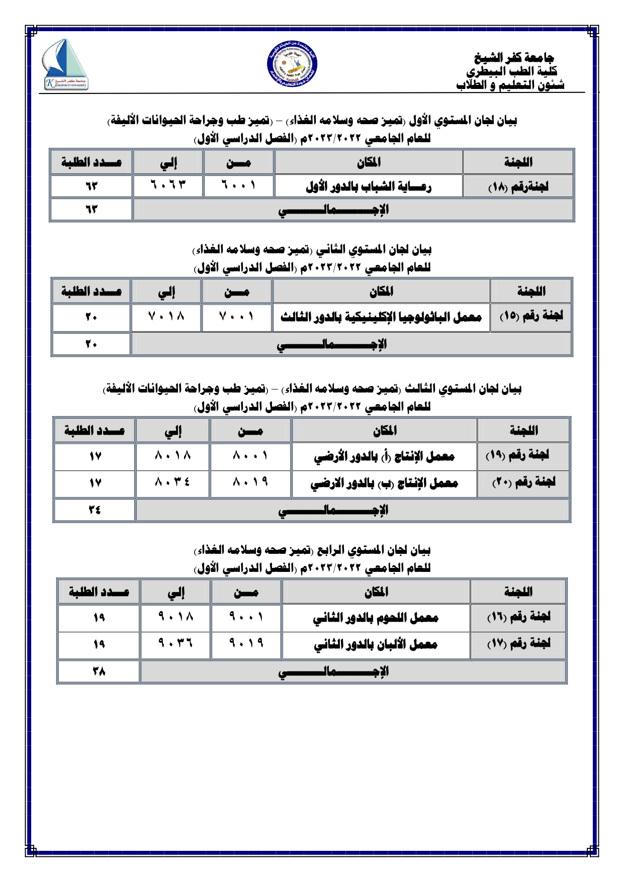 اماكن اللجان لجميع الفرق الدراسية للعام الجامعى 2022/2023